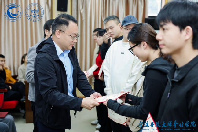 现场表彰环节亮点纷呈,学院领导分别为获得“国家开放大学优秀毕业生”“宁波开放大学励志奖学金”“奉化学院优秀学员奖学金”“2025春开放教育优秀毕业生”等荣誉称号的学员颁发荣誉证书及奖品,以榜样力量激励新色生笃学奋进,争先创优。 随后举行的学士学位授予仪式上,院长韩盛杰为15名本科学员授予学位证书。此次学位获得人数较2024秋增加7人,创历史新高,实现学位申请和获取人数双重突破,彰显学院教学质量的稳步提升。