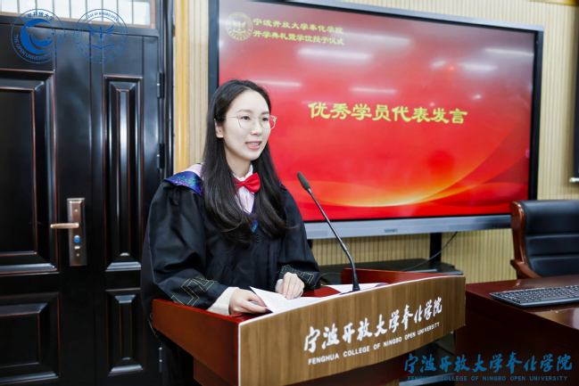 优秀毕业生代表、2022秋法学本科学员裘家琦分享了自身学习感悟,向学院和老师表达诚挚谢意,鼓励全体新生珍惜学习机遇,在提升学历的同时注重学用结合,在各自的岗位上实现价值、发光发热。