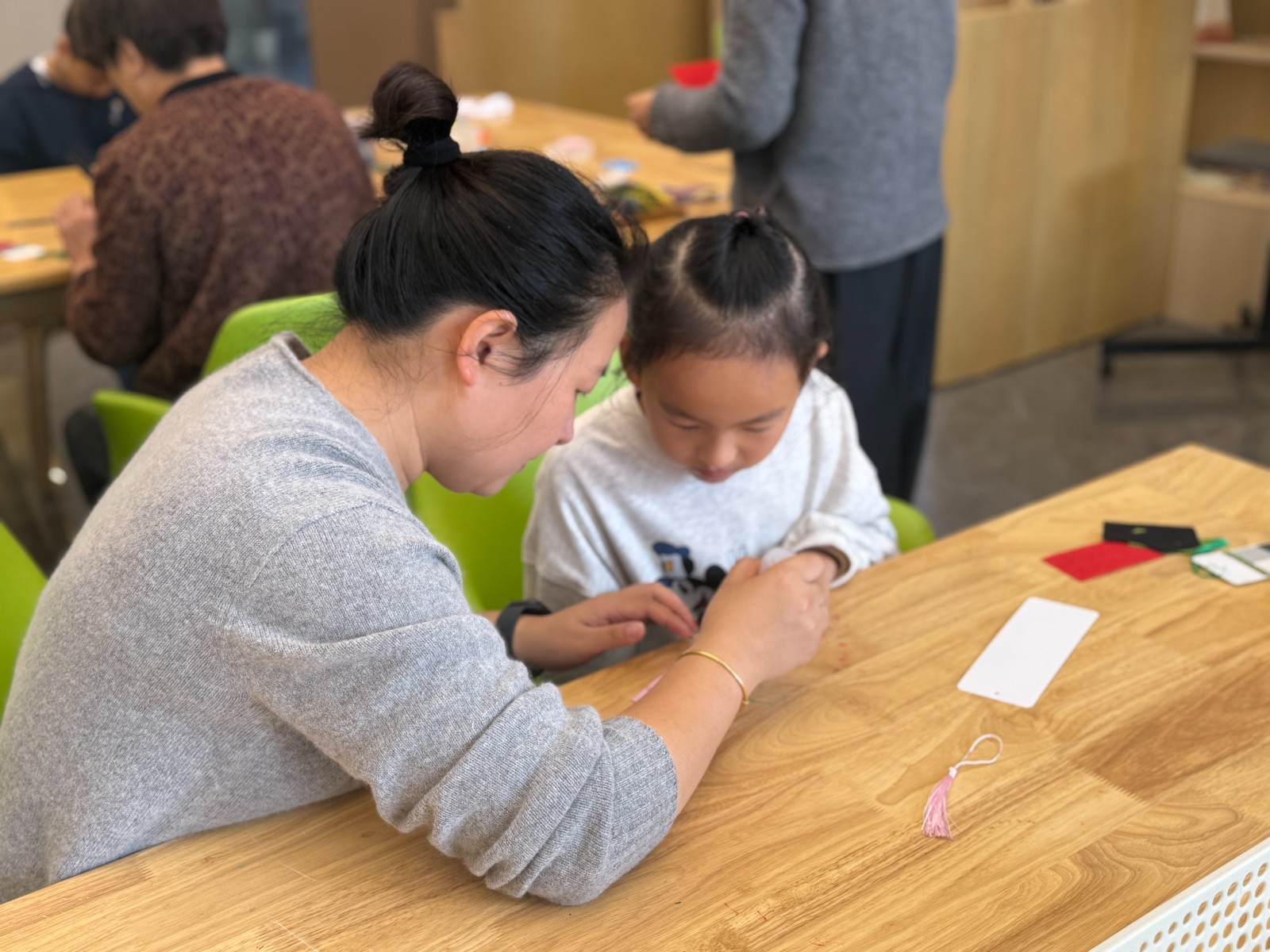 创作过程中,大家兴致高昂、互帮互助。小朋友们用彩线勾勒卡通图案;老年居民则凭借娴熟的针线活,缝制出素雅精致的传统样式;亲子家庭默契配合,家长裁剪布料,孩子搭配装饰,在协作中增进了感情。现场欢声笑语不断,原本普通的棉布、针线,经过大家的巧思和巧手,变成了一个个独一无二的精美书签。