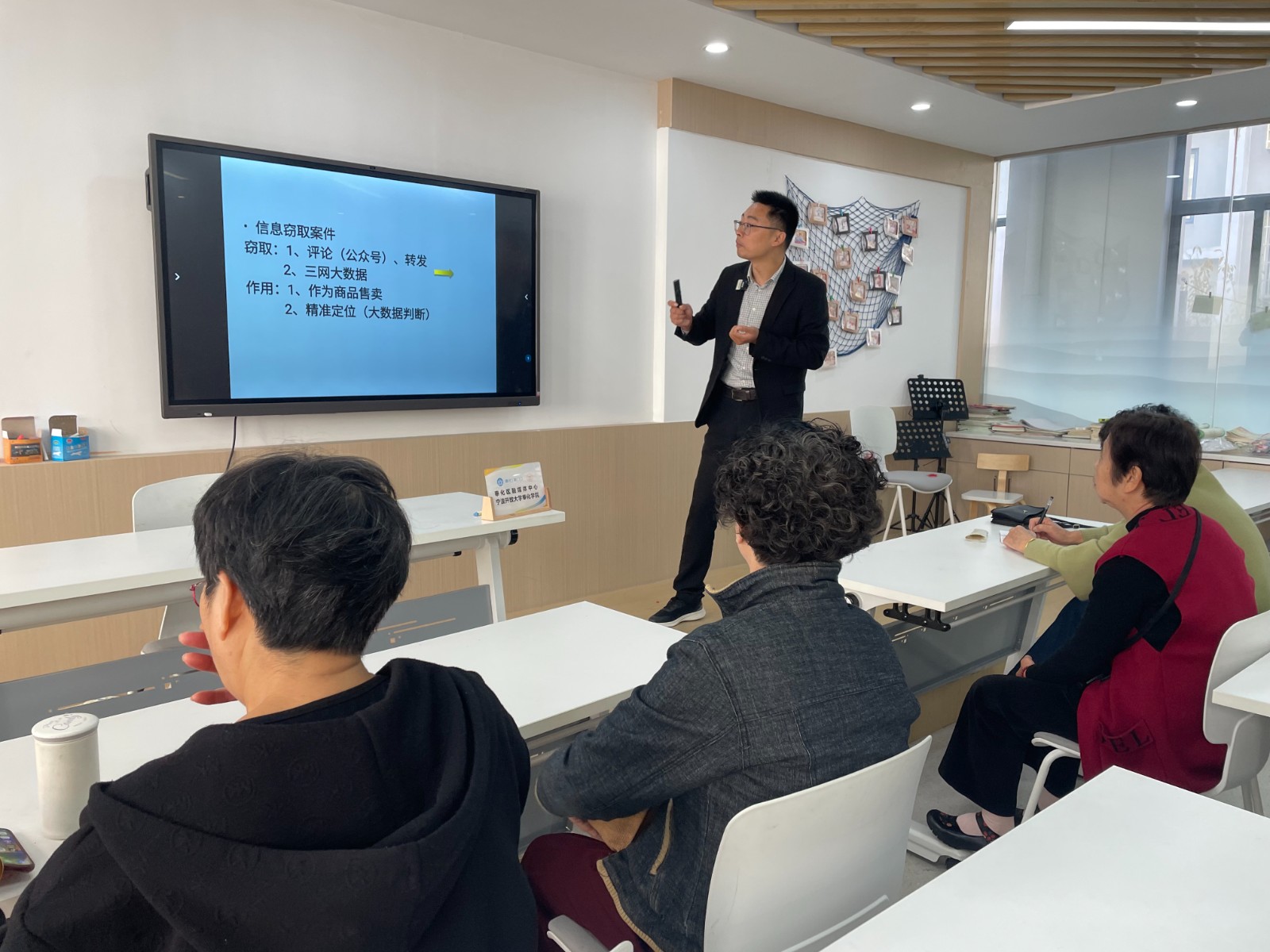 讲座中,马老师用通俗易懂的语言,结合生动形象的案例,为居民们深入浅出地讲解了AI技术的基本原理与应用场景。内容不仅涵盖了智能推荐、语音助手等居民日常接触的AI服务,还重点剖析了当前常见的AI诈骗手段、数据泄露风险以及个人信息被滥用的潜在危害。