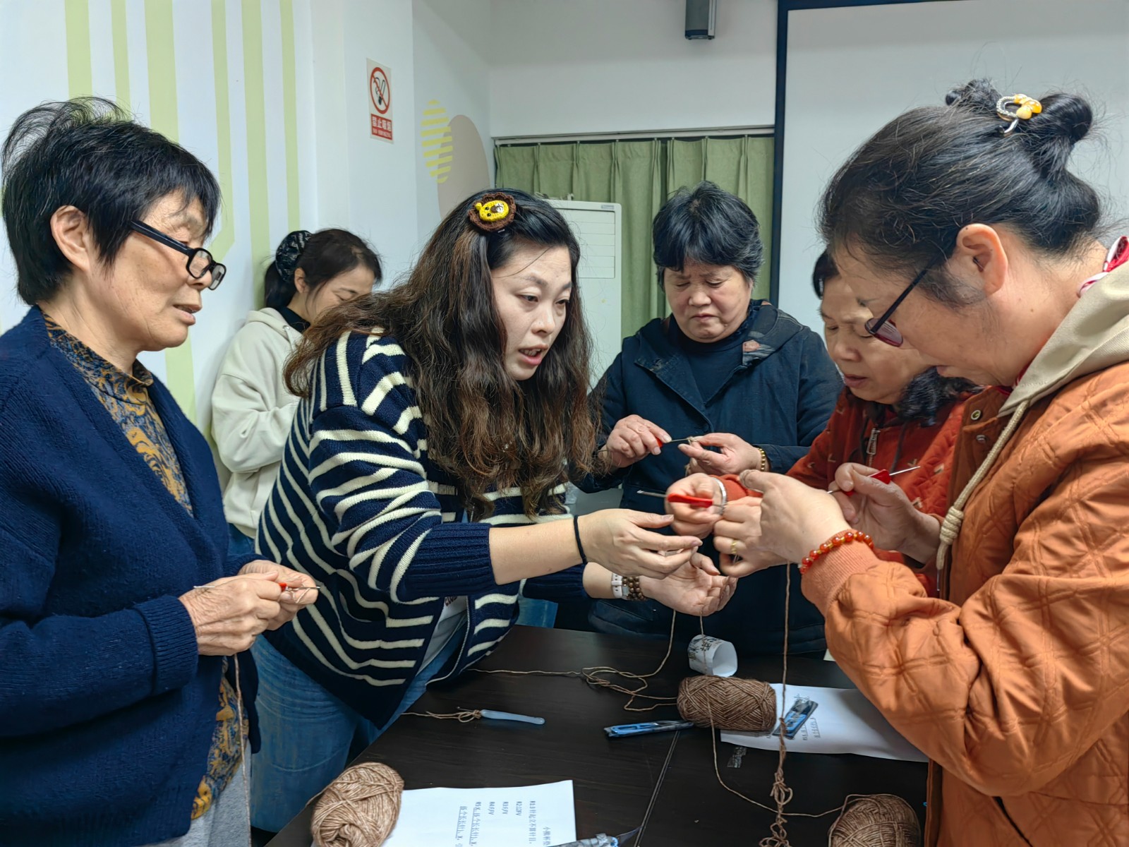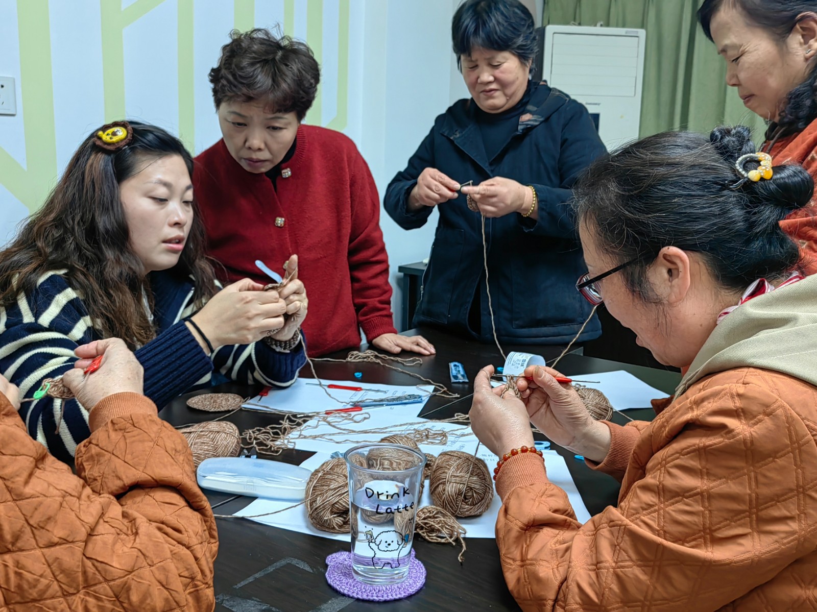 活动现场暖意融融,大家专注于手中的创作,细细缠绕每一缕毛线,眼神中满是认真,小小的杯垫承载着温馨的社区时光。遇到难题时,居民们互相请教、分享技巧,原本互不熟悉的邻里在交流中逐渐熟络,现场充满了互帮互助的和谐氛围。