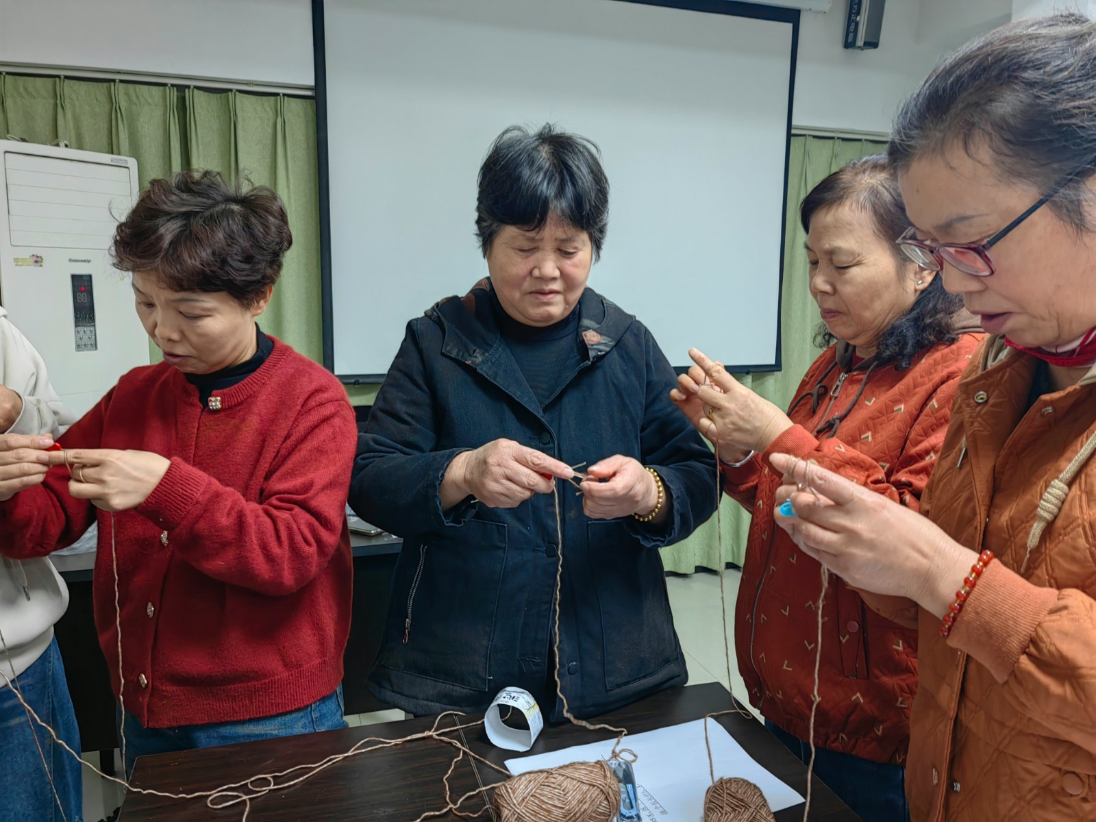 活动开始前,社区工作人员已经将棕色毛线、剪刀、钩针等材料准备齐全,并特别邀请了开放大学的张老师担任现场教学,确保无论是手工新手还是老年朋友都能轻松参与。