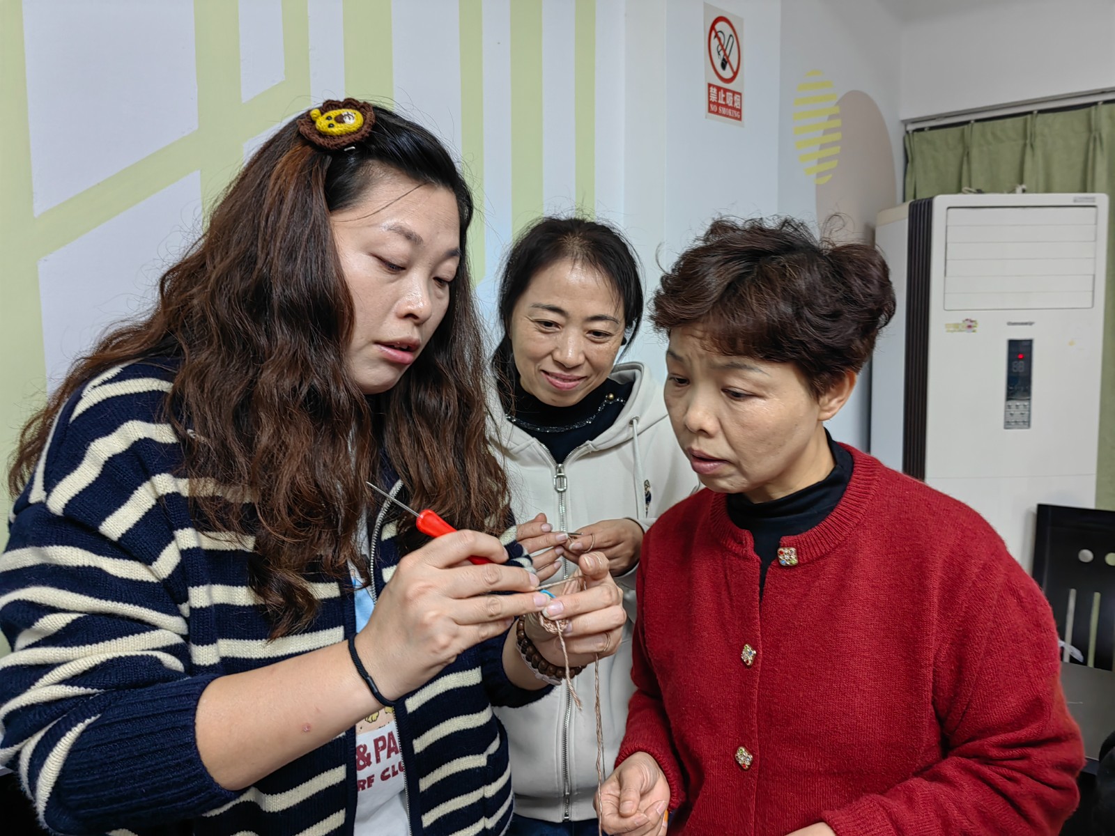 活动现场,张老师结合提前做好的样品,用通俗的语言讲解小熊杯垫的制作步骤:从如何起针、绕线松紧度控制,到小熊耳朵的编织,每一个细节都讲解得细致入微。“绕线的时候要均匀用力,这样小熊的耳朵才饱满好看”“每一针都不能穿错了”,张老师一边演示,一边指导,遇到操作较慢的居民,她便蹲在身旁手把手教学,耐心纠正绕线手法。