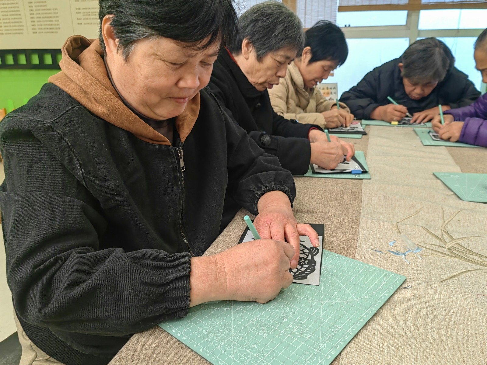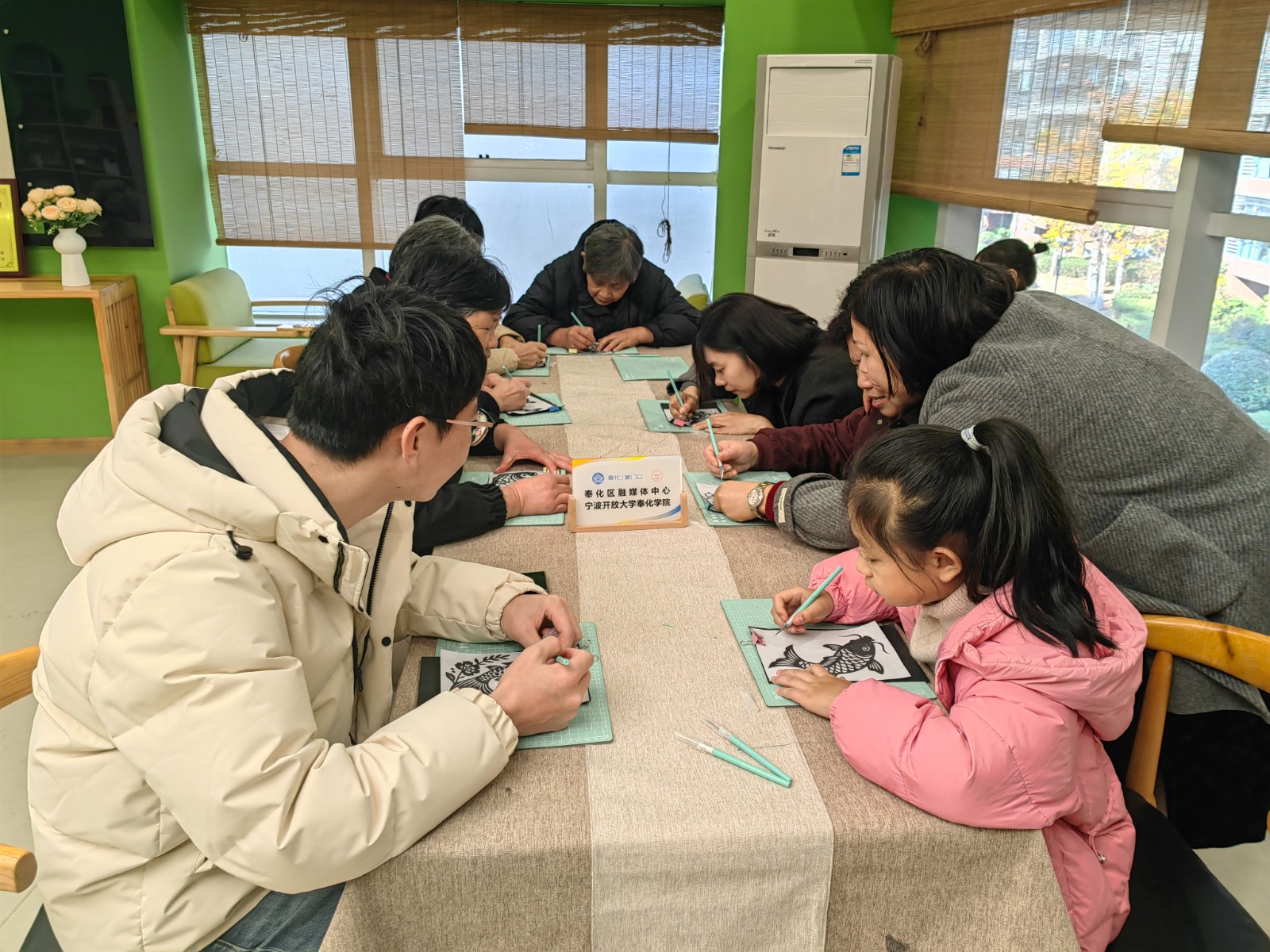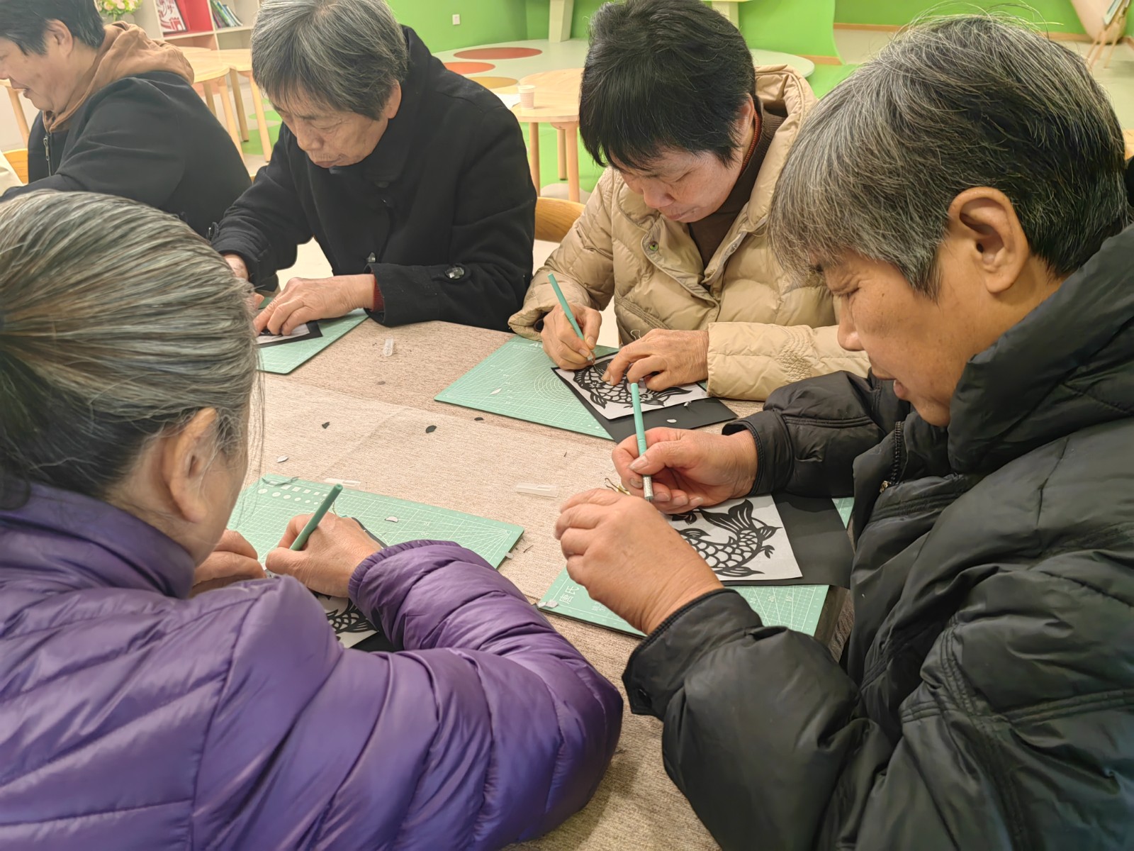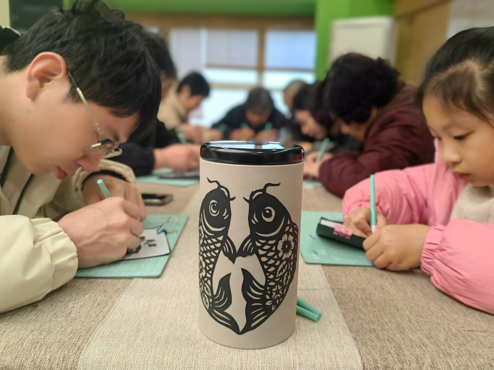 制作环节中,现场氛围热烈而温馨。大朋友们与小朋友们默契配合,有的对照模板认真勾勒鱼的轮廓,有的拿起刻刀小心翼翼地沿着线条雕琢,一点点刻画鱼鳞、鱼鳍的细节,动作专注又细致;期间,大家相互交流创作心得,分享小妙招,不时传来阵阵欢声笑语。陈老师则穿梭其中,耐心解答大家的疑问,协助完成刻制、粘贴等步骤,确保每位居民都能顺利完成自己的作品。
