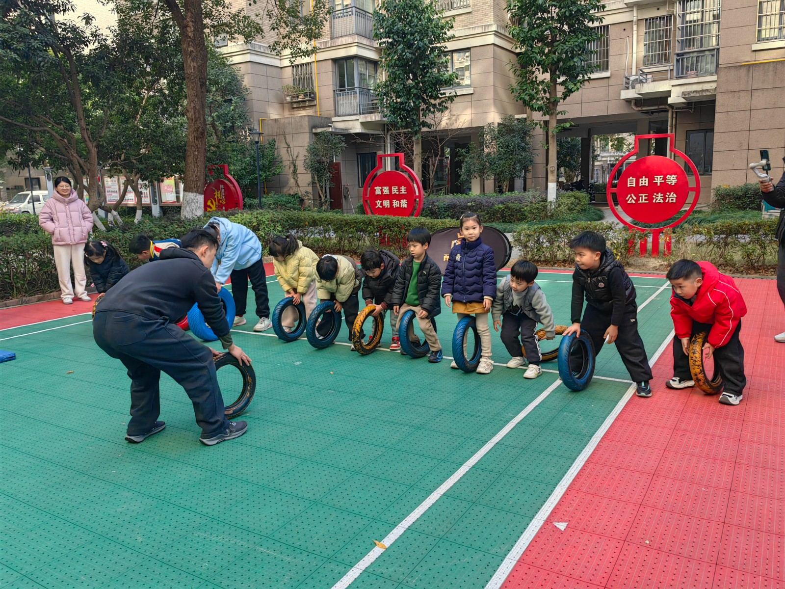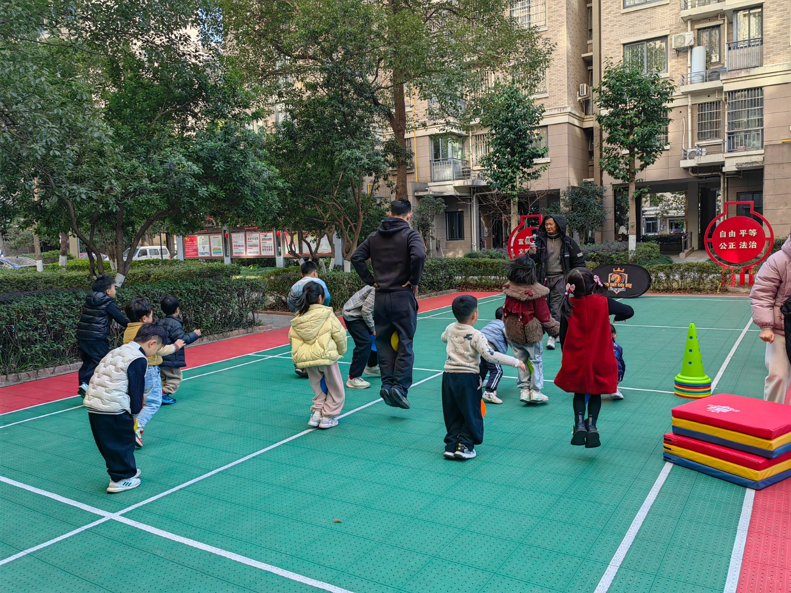 近一小时的活动里,广场上欢笑声、加油声此起彼伏。12位小朋友全程热情高涨,在游戏中锻炼了肢体协调性与力量,更在互动中结识了玩伴。活动结束时,孩子们脸上都洋溢着意犹未尽的笑容,依依不舍地与同伴告别。