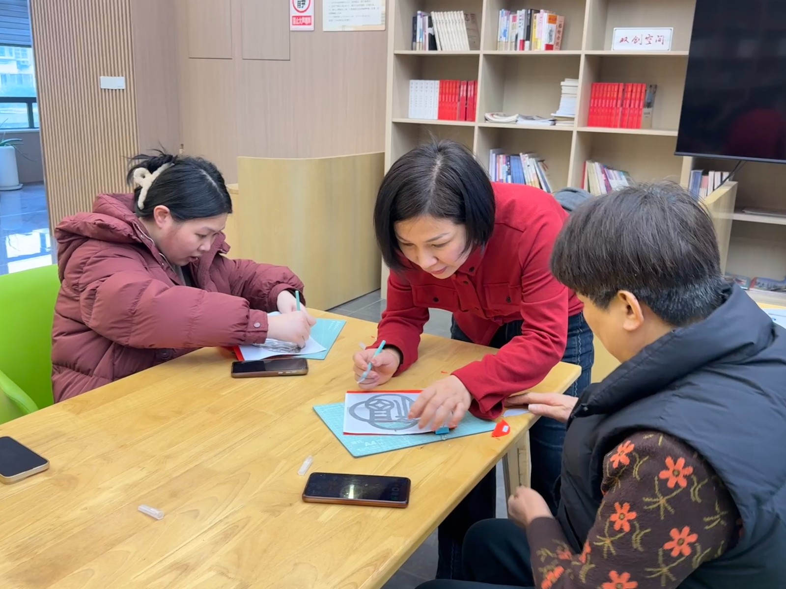 活动现场,老师为大家详细讲解福摆台的制作步骤与创意技巧,从底板剪裁、图案拼贴,到装饰点缀、细节调整,每一步都耐心示范、细致指导。居民们热情高涨,纷纷发挥想象力与创造力,有的将喜庆的福字贴在摆台中央,有的搭配吉祥如意的剪纸图案,有的别出心裁地挂上精致流苏,还有的在边角处点缀小巧的中国结。