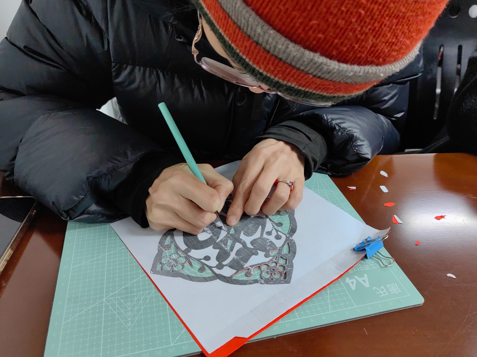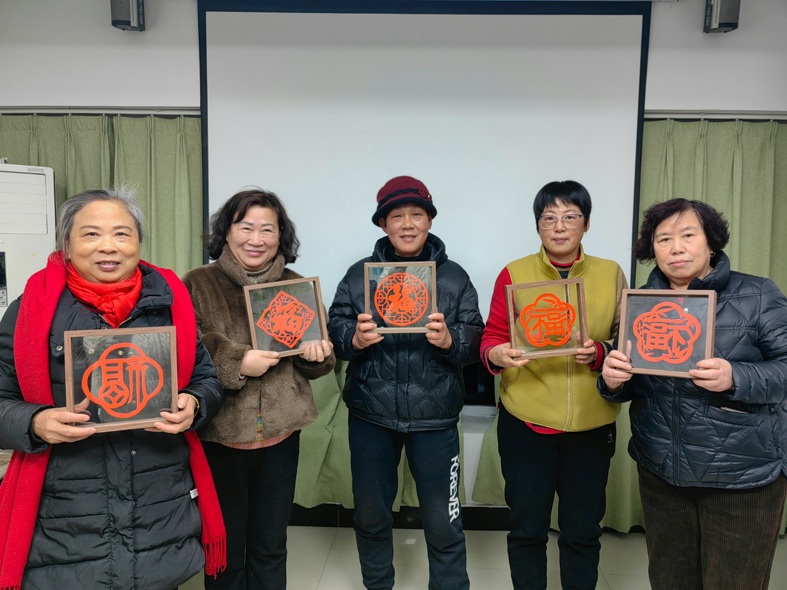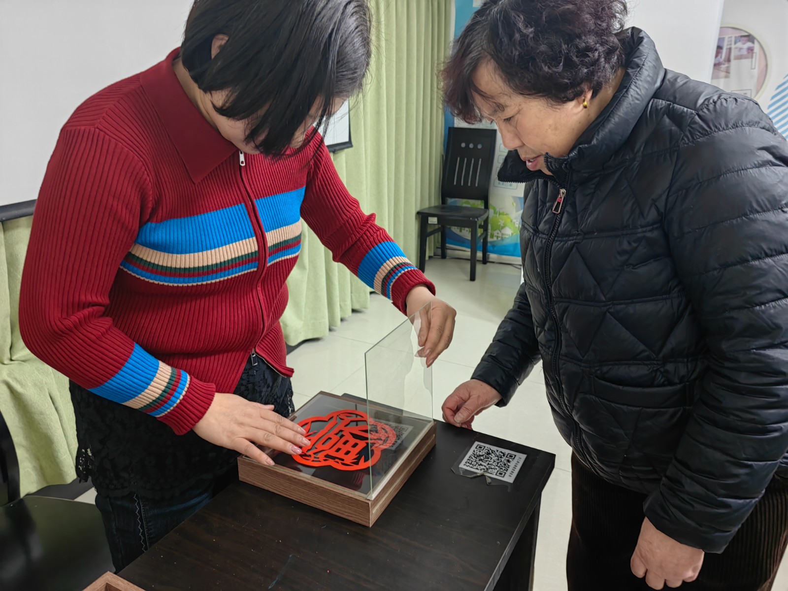 在陈老师的指导下,居民们纷纷拿起刻刀,沉浸在刻纸的乐趣中。红色的宣纸在手中旋转,刻刀在纸上穿梭游走,居民们的讨论声此起彼伏。经过一番精心雕琢,一张张形态各异、寓意吉祥的福字窗花新鲜出炉。随后,大家将自己亲手刻好的福字小心翼翼地放入透明相框中,调整位置、固定成型,一个个独一无二的福气摆台就此诞生。