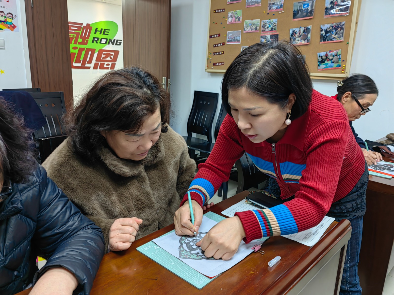 活动现场早已备好红色宣纸、刻刀、透明相框等物料,满满的新春氛围感让居民们跃跃欲试。在活动开始前,陈老师先向居民讲解了福字的文化寓意、刻字的基本手法和注意事项,耐心叮嘱大家把控力度、注意安全,让居民们快速掌握刻纸核心要领。