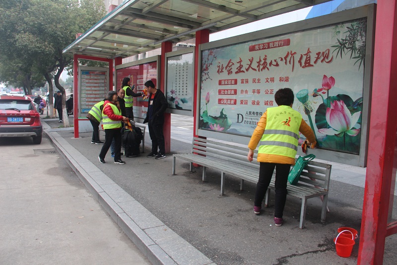 志愿者们身穿志愿者服,拿着小桶、抹布直奔横河路两侧公交站点。他们有的捡拾垃圾,有的擦洗站台,干劲十足,不怕脏不怕累,齐心协力,将公交站点的地面、座椅清扫的干干净净。不到一小时,公交站台的座椅和标识牌焕然一新,地面以及绿化带周围的垃圾也清扫一空,环境顿时洁净优美,生机盎然。